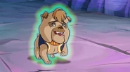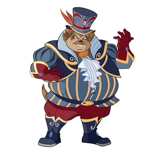 В превращении выглядит как монстр-пёс, похожий на спаниеля. Носит голубой дублет с золотыми полосами и ремнем под пузом, который снова мал, синий жилет, с золотыми краями и высоким воротом, жабо, красные перчатки, заправленные в рукава, красные шоссы, синие сапоги и шляпу, украшенную красными перьями.