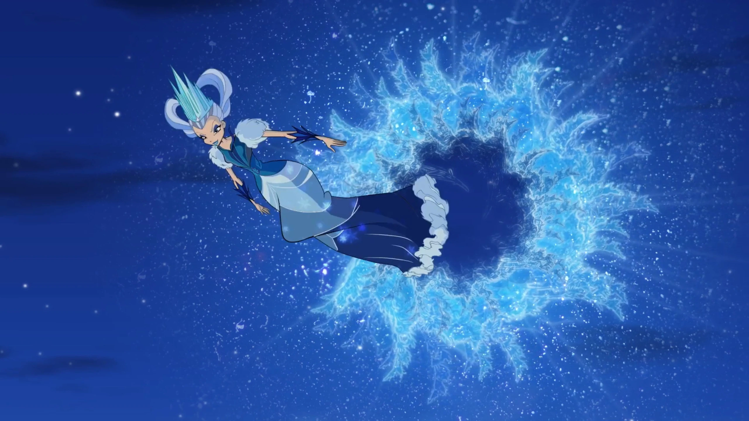 В небе вспыхивает яркий свет, и из дыры-портала появляется Снежная королева. Она замораживает весь Фирвуд и леса, покрывая льдами. Винкс превращаются в Блумикс, а Дафна в Сиреникс, вступая в бой с ней. В ходе битвы Флора рвётся вперёд, но оказывается побеждена Айси, когда та заморозила её крылья, из-за чего Флора падает с высоты в лес, пока подруги продолжают сражаться с ведьмой. Блум пытается растопить весь лёд Айси, но ведьму победить не удаётся.