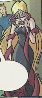 Её наряд состоит из длинного чёрного платья с глубоким вырезом на груди и бретелькой на левом плече. На шее она носит маленькое пурпурное полотно, такая же ткань (но длиннее) обернута вокруг верхней части тела. У коленей, платье имеет А-образную форму благодаря пурпурным оборкам. В этом наряде она босиком.