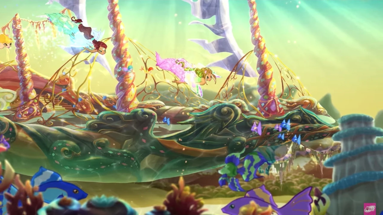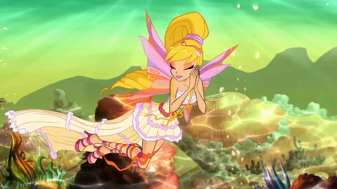 Именно здесь Стелла создаёт узы с Эйлирис, восстанавливая её силы, которые отнял Тританнус. Затем они направляются в пещеру, где сталкиваются с мутировавшей медузой, которая находилась под влиянием загрязнения Тританнуса. Она превращает Флору в камень, однако Стелла находит щит с камнем уверенности в себе и использует его, чтобы отразить окаменяющий взгляд обратно на медузу, превратив ее в каменную статую. Затем Стелла снова использует щит, чтобы снять проклятие с Флоры. Все Винкс получают камень уверенности в себе в свои Шкатулки Сиреникса.