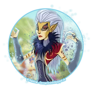 Высокая и худая. Носит серо-синий тугой корсет, под которым серый обтягивающий комбинезон без рукавов и красная разорванная юбка. На плечах по два браслета, выше красные доспехи с красно-серой шерстью вокруг шеи и на предплечьях. Ноги в высоких серых сапогах. Волосы седые, высоко зачесаны назад. Охровая кожа, эльфийские острые уши. Алые губы, длинные черные ногти, вместо бровей сине-красный орнамент, нос кошачий.