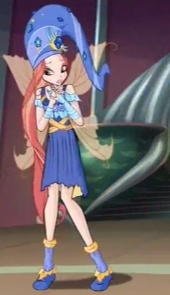 Одета в короткое синее платье, перевязанное желтыми лентами на талии, край которого небрежно оборван, голубые перчатки, больше похожие на бинты. Обувь тканевая, на голове огромный колпак, украшенный синими кристаллами. В трансформации феи имела полупрозрачные желтые крылья.