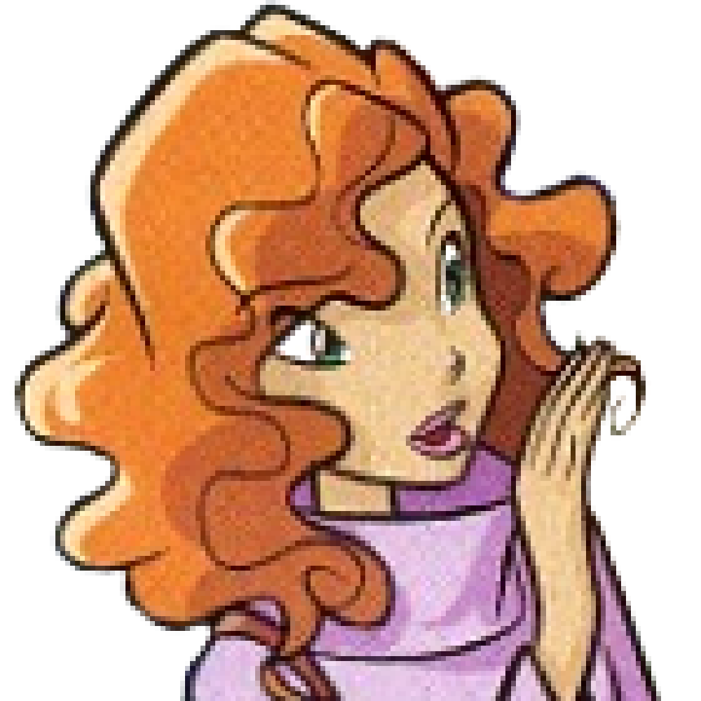 Молодая женщина с кудрявыми рыжими волосами средней длины и зелёными глазами. Носит розовую кофту с высокой широкой горловиной и коричневую сумку на плече.