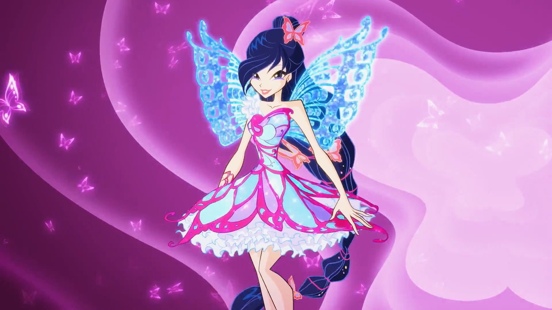 Наряд в Баттерфликсе — сине-розово-голубое платье, на ногах розовые туфли с фиолетовой подошвой. На правой руке браслет, волосы завязаны в хвост, на резинке присутствует бабочка. Крылья большие, голубые с синим оттенком.