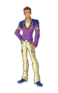 Так как он не воин, а маг, его боевой костюм отличается от одежды специалистов, — это фиолетовые свободные штаны и удлиненная кофтой с рукавами по локоть и светло-желтыми вставками.