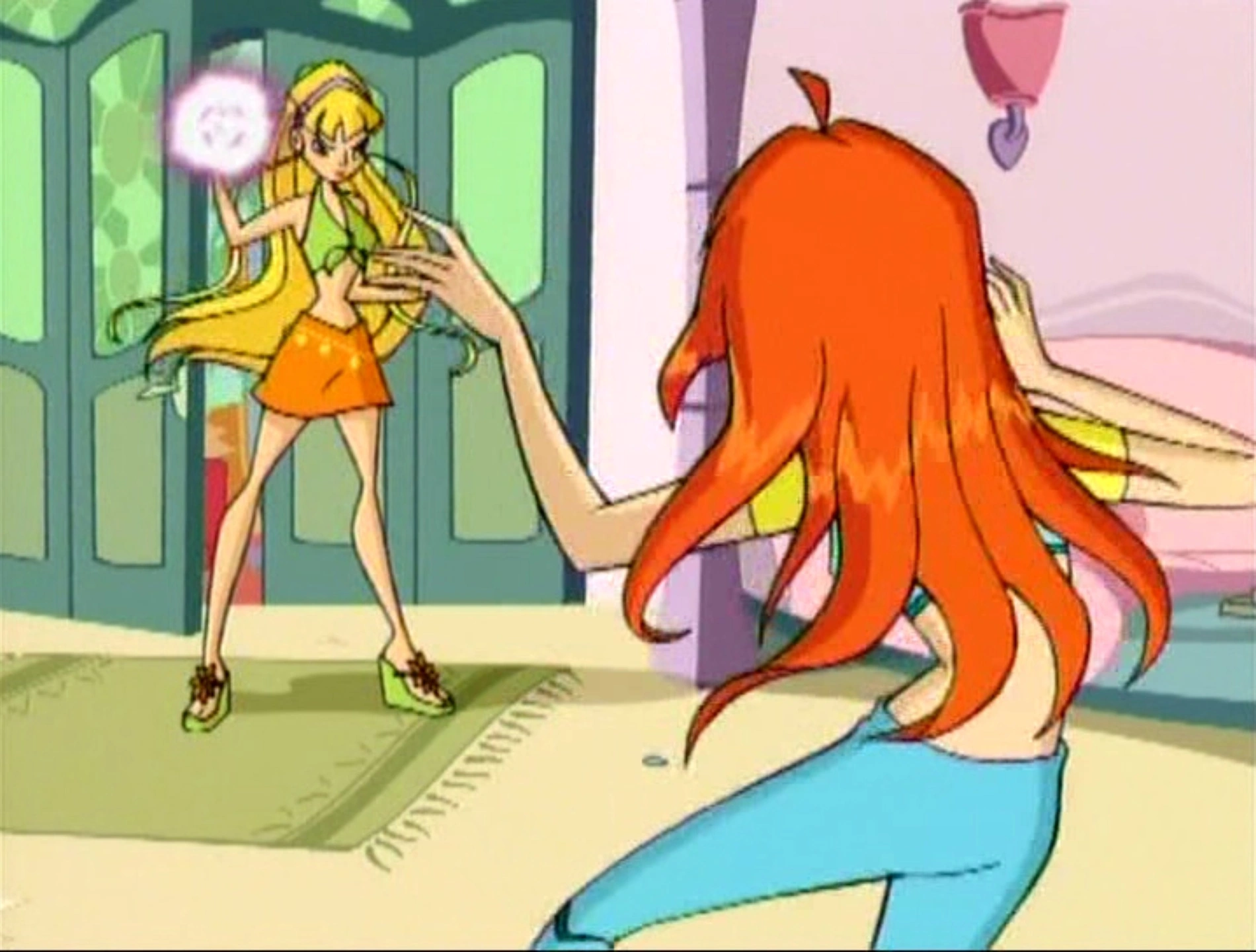 Винкс выходят из аудитории, и Муза обращает внимание на то, что Стелла даже не явилась на урок. Текна предполагает, что что-то могло случиться, о чём она не хочет им рассказывать. Блум решает узнать у неё причины прогула и когда она входит в жилые комнаты Винкс, то видит всюду разгром, как при обыске. Стелла оказывается в комнате Музы и Текны, и она требует у Блум своё кольцо. В ответ на просьбу Блум успокоится, Стелла атакует свою подругу, а затем, назвав Блум воровкой, выпрыгивает в окно.
