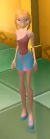 У нее короткие светлые волосы, глаза карего цвета, на щеках есть веснушки. Она носит темно-фиолетовый топ на одной лямке с светло-синими линиями и светло-голубую юбку с розовыми линиями. На её ногах голубые туфли на платформе.