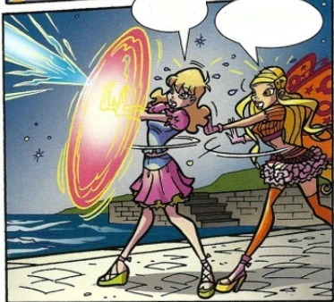 - Щит: девушка колдует овал, который превращается в красно-оранжевый щит. Таким образом, Синди попыталась защитить себя и Стеллу от атаки Огрона.