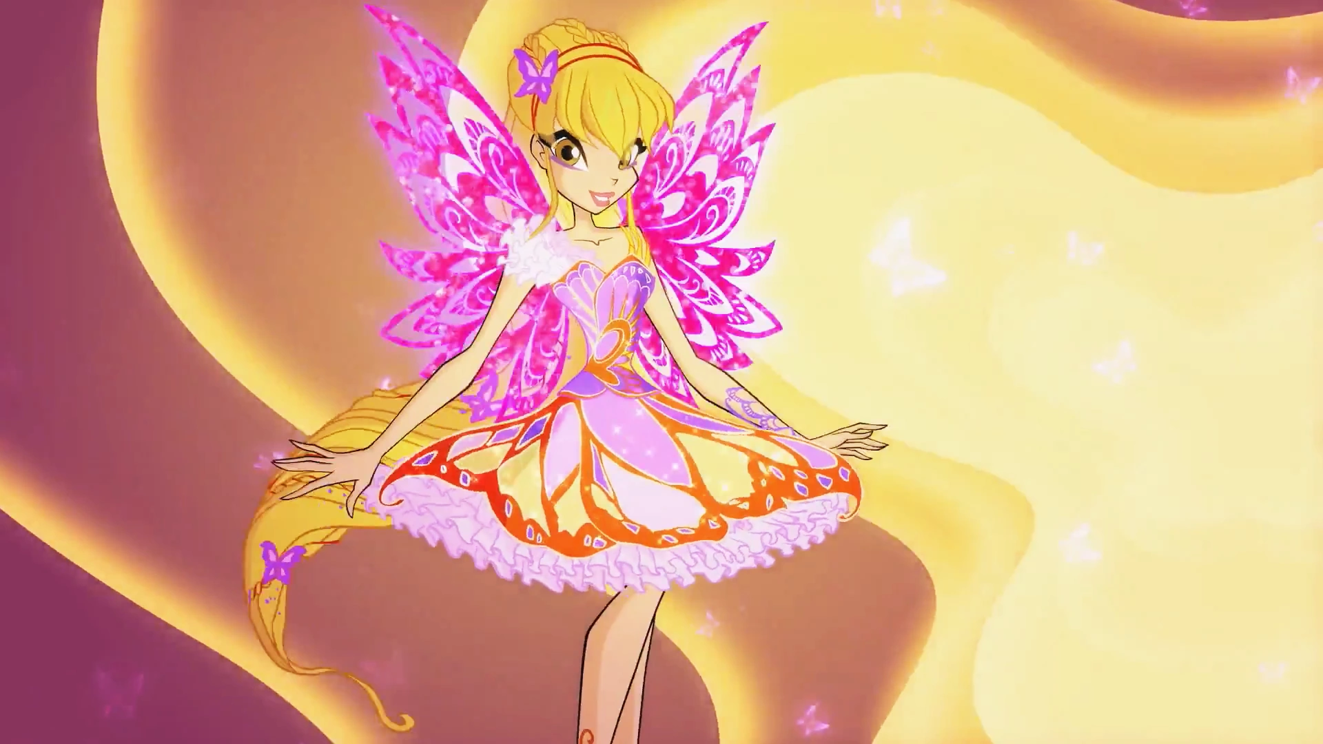 В Баттерфликсе волосы собраны в хвост, украшенный несколькими заколками в виде фиолетовых бабочек, на голове обруч розового цвета, с краю которого ещё одна фиолетовая бабочка. Наряд состоит из оранжево-фиолетового платья с бретельками оранжевого и белого цветов и туфель оранжевого цвета. Крылья среднего размера, ажурные и ярко-розовые.