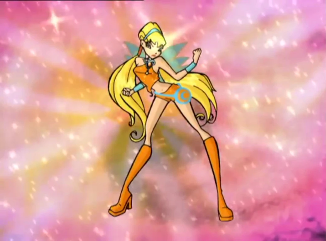 Основным цветом трансформаций Стеллы является оранжевый. Нередко можно встретить фиолетовый и розовые цвета для деталей нарядов. В Блумиксе присутствует вишневый цвет. В Мире Винкс в превращении Онирикс основной цвет сменяется бирюзовым. Костюм Стеллы в первой трансформации состоит из сверкающего оранжевого купальника с шортами и сверкающего оранжевого топа с одной бретелькой, коротких шорт того же цвета и высоких оранжевых сапог. Её волосы стягиваются оранжевыми лентами в два хвоста. Также голову феи украшает ободок нежно-голубого цвета. Крылья Стеллы, лёгкие и трепещущие, представляют собой шесть голубых лепестков с «тенями» по краям. Её наряд дополнен голубыми браслетами на запястьях.