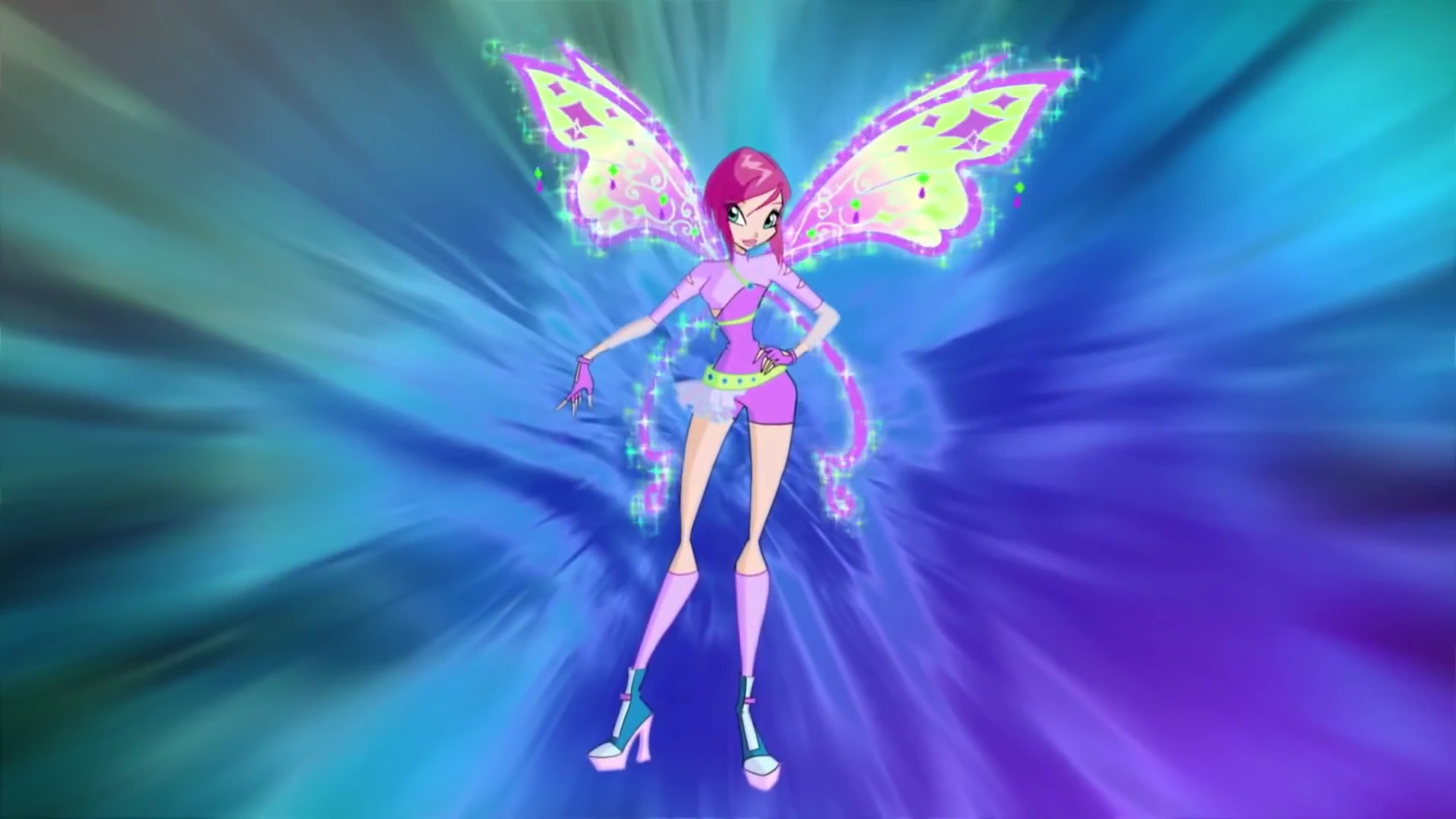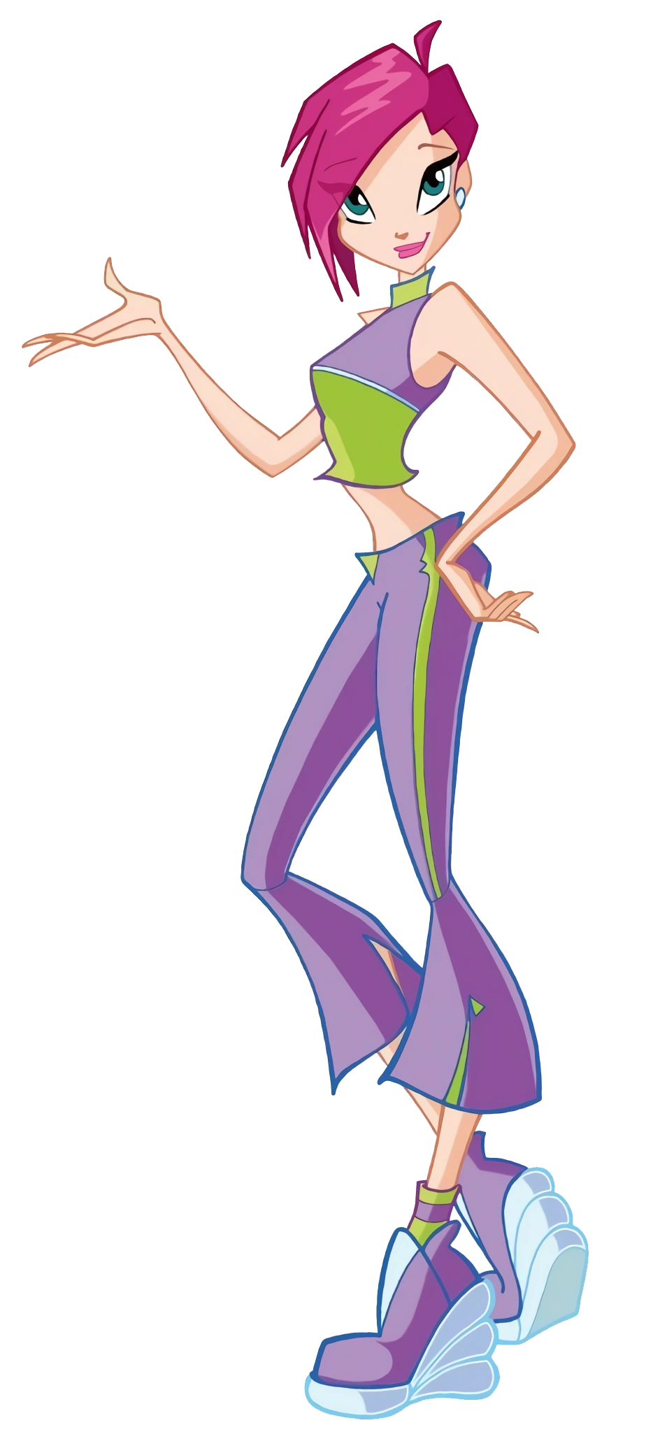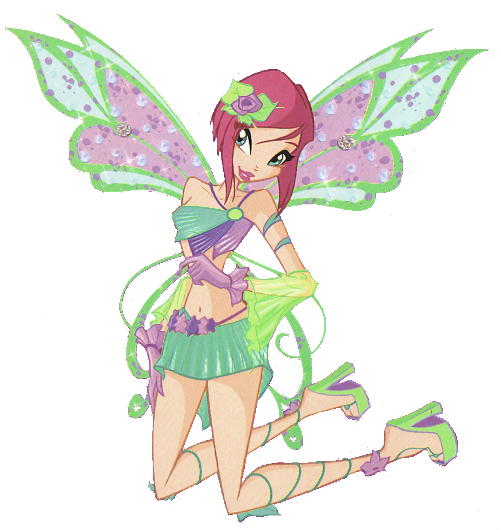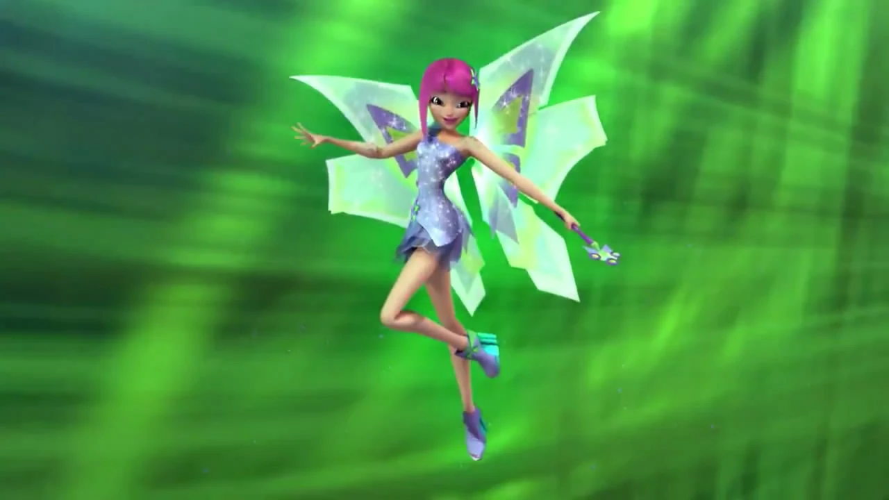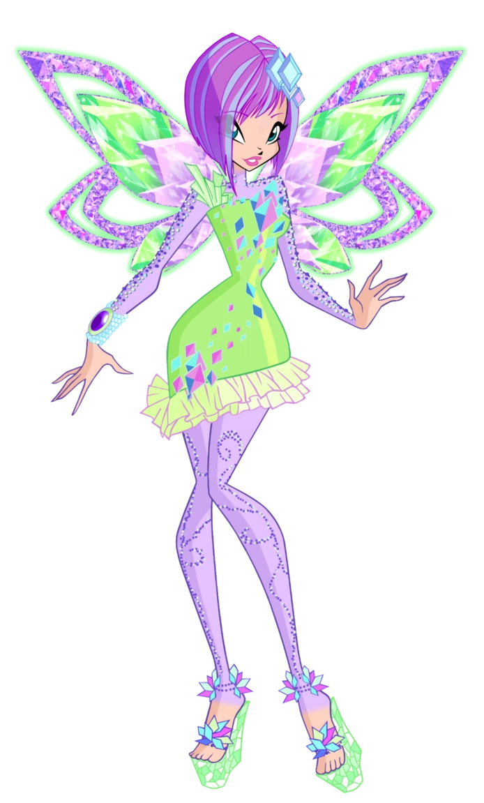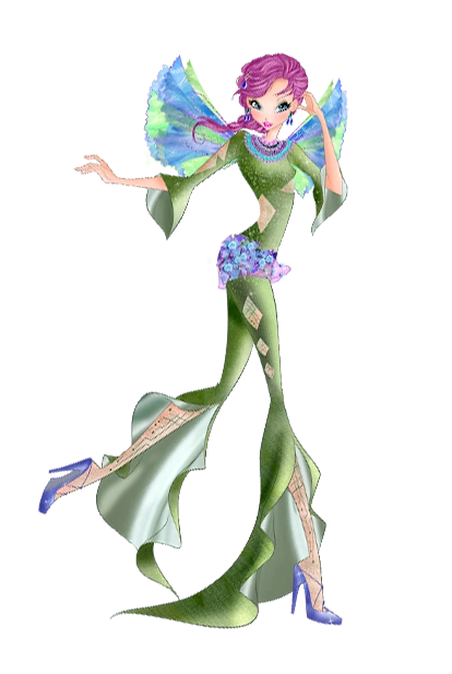 Беливикс — это сиреневый облегающий комбинезон с шортами и туфли на массивном каблуке с гольфами того же цвета. Крылья большие, переливающиеся, с узором.