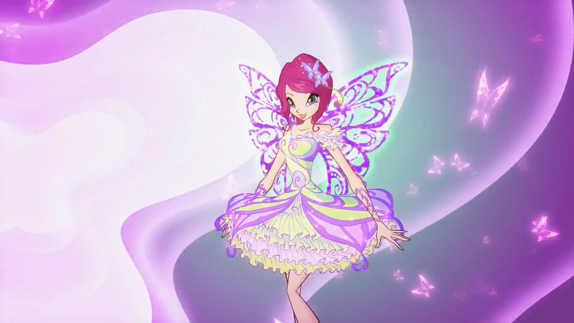 Баттерфликс Текны — платье, состоящее из салатовых и фиолетовых секторов и узором напоминающее крыло бабочки, заканчивающееся пышной многослойной юбкой более светлых оттенков. На ногах фиолетовые туфли с салатовой подошвой. На голове две сиреневых заколки в виде бабочек, от одной из них отходит салатовая лента. Несколько передних прядей завиты. Крылья довольно крупные, состоят из ажурного фиолетового каркаса с прорезями разного размера, по форме также напоминают крылья бабочки.