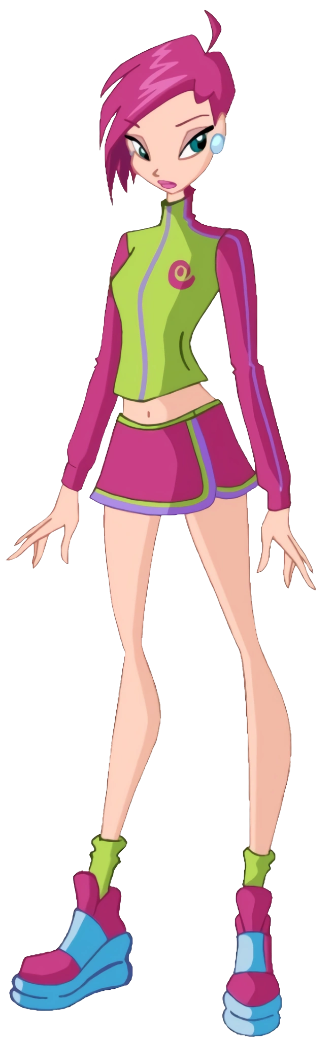 В Софиксе на голове заколка зелёного цвета, наряд состоит из розового купальника с юбками, розового топа и маленькой зелёной юбки с сиреневым поясом. На запястьях рук рукава с зелёным оттенком. На ногах туфли с зелёной подошвой. Крылья большие, розовые с салатовым, похожи на крылья Беливикса.