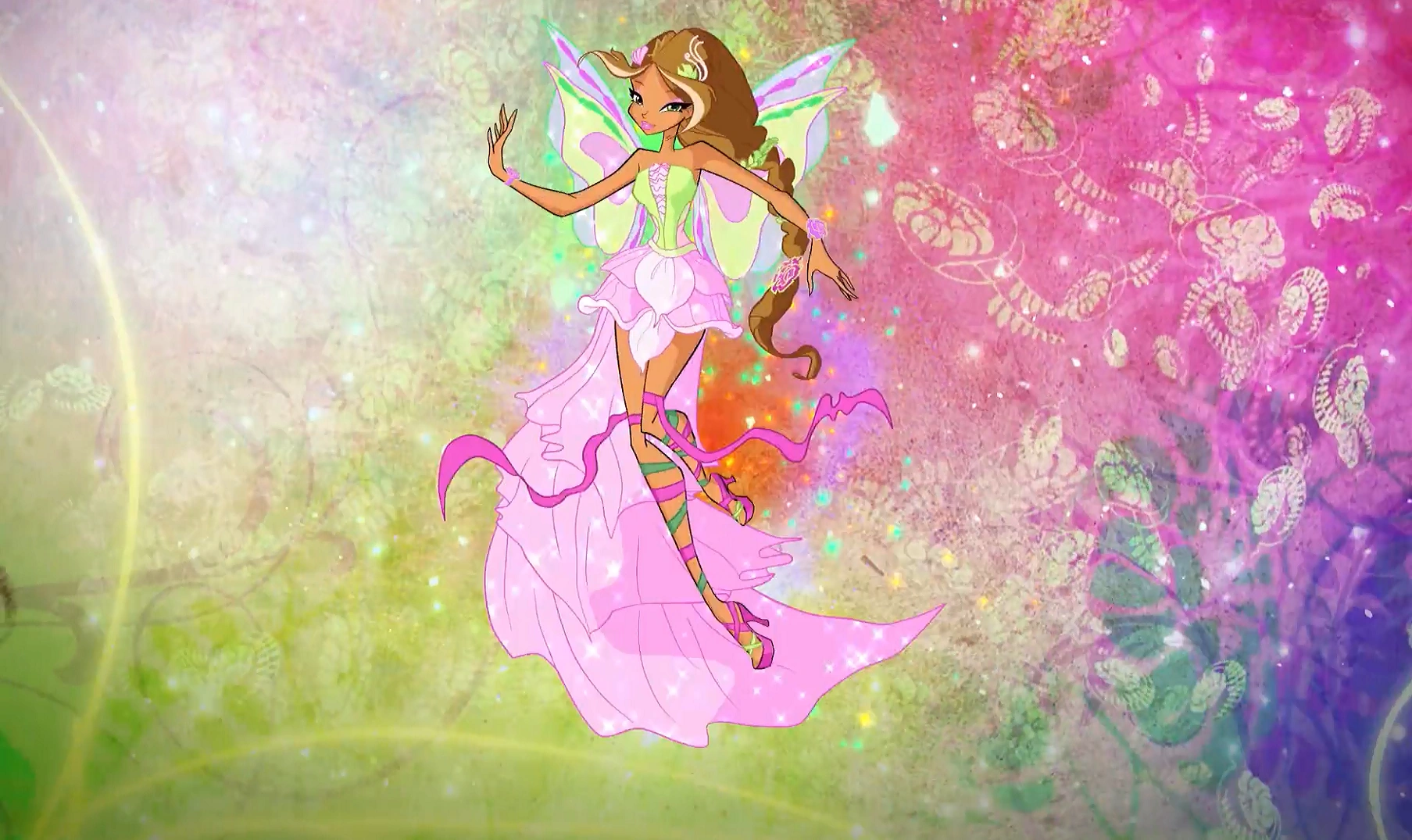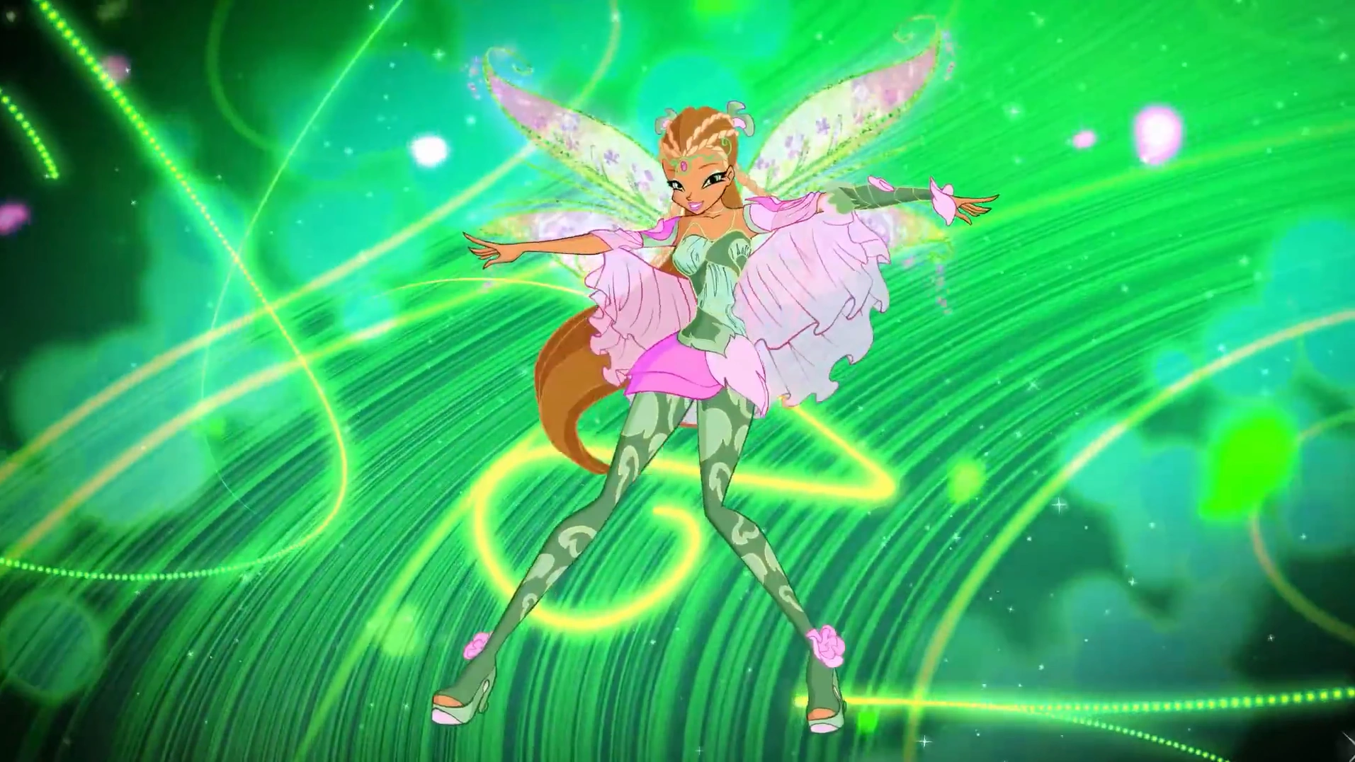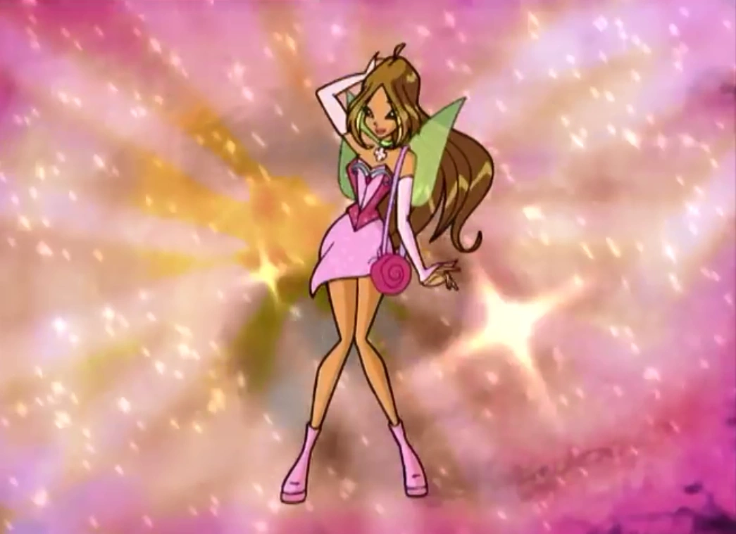 Первое превращение Флоры представляет собой элегантное короткое блестящее платье цвета фуксии и нежной орхидеи, длинных розовых рукавов, и ботинок на платформе. Крылья в виде двух зелёных листочков.