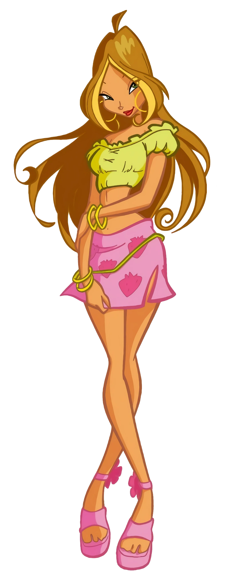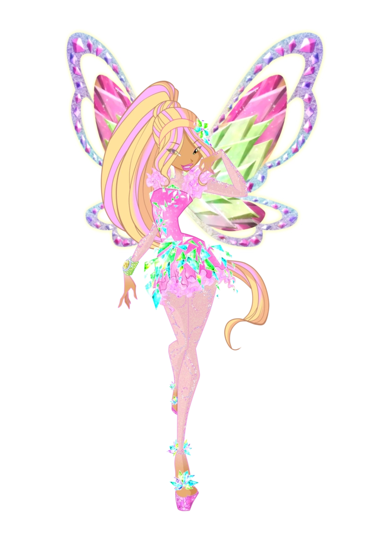 Лавикс: розовый купальник с юбками, розовые топ и юбка с изящными подвесками, соединенные между собой; розовые митенки; салатовые сапоги и гольфы; розовые крылья.