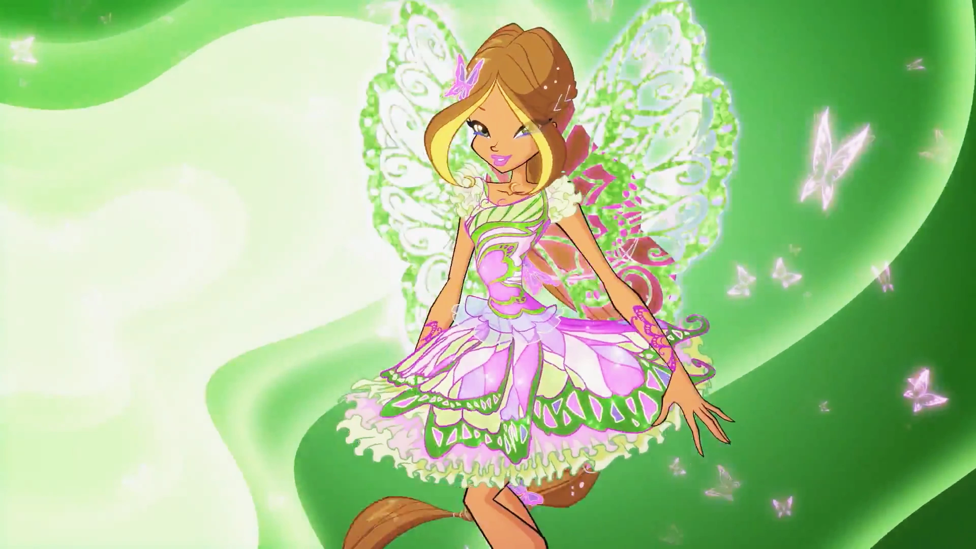 Баттерфликс Флоры состоит из зелёного с розовым пышного платья и розовых босоножек, на руках намотаны розовые ленты, а крылья салатовые и ажурные. Волосы заплетены в косу, а голова украшена розовой бабочкой.